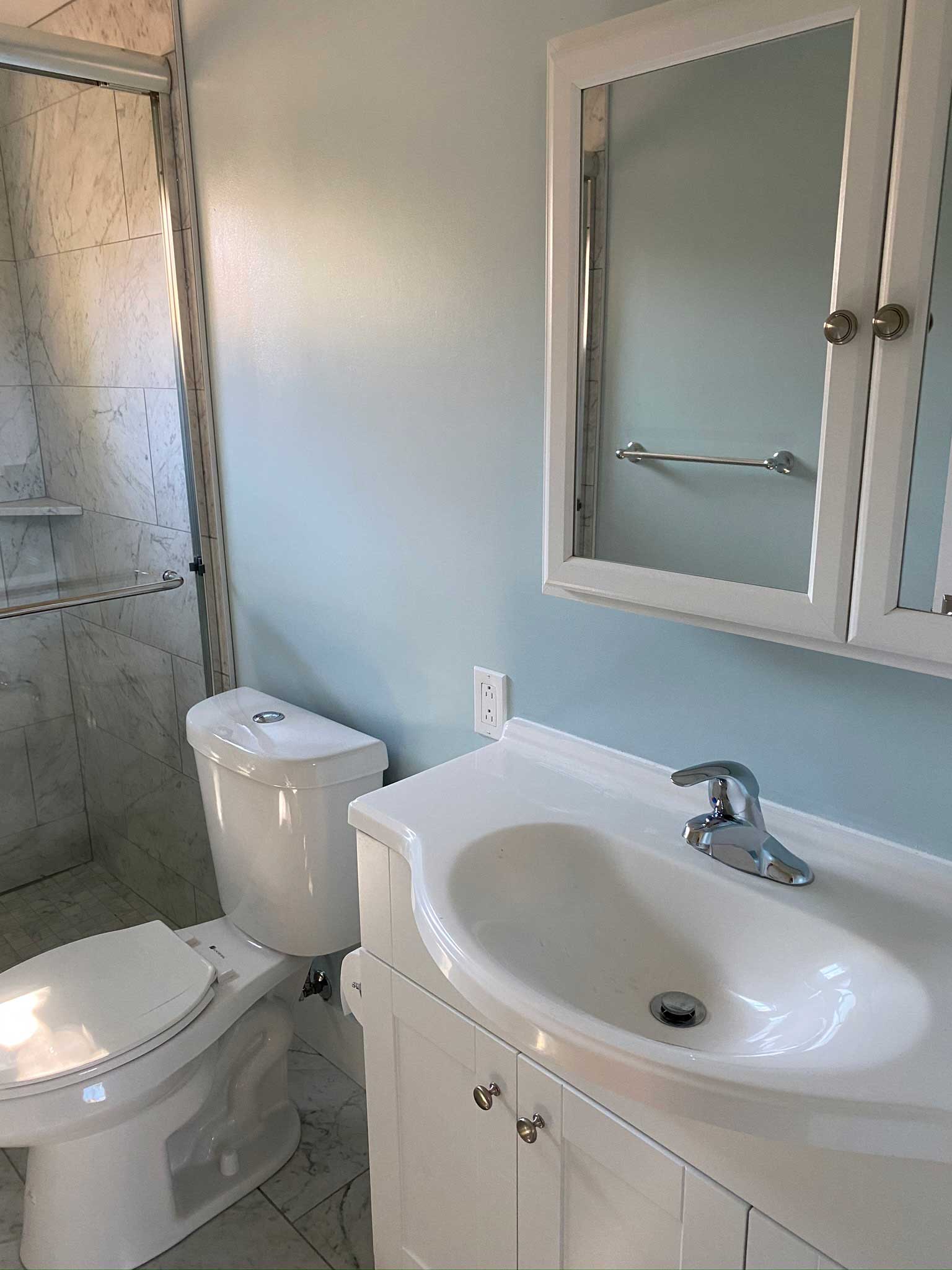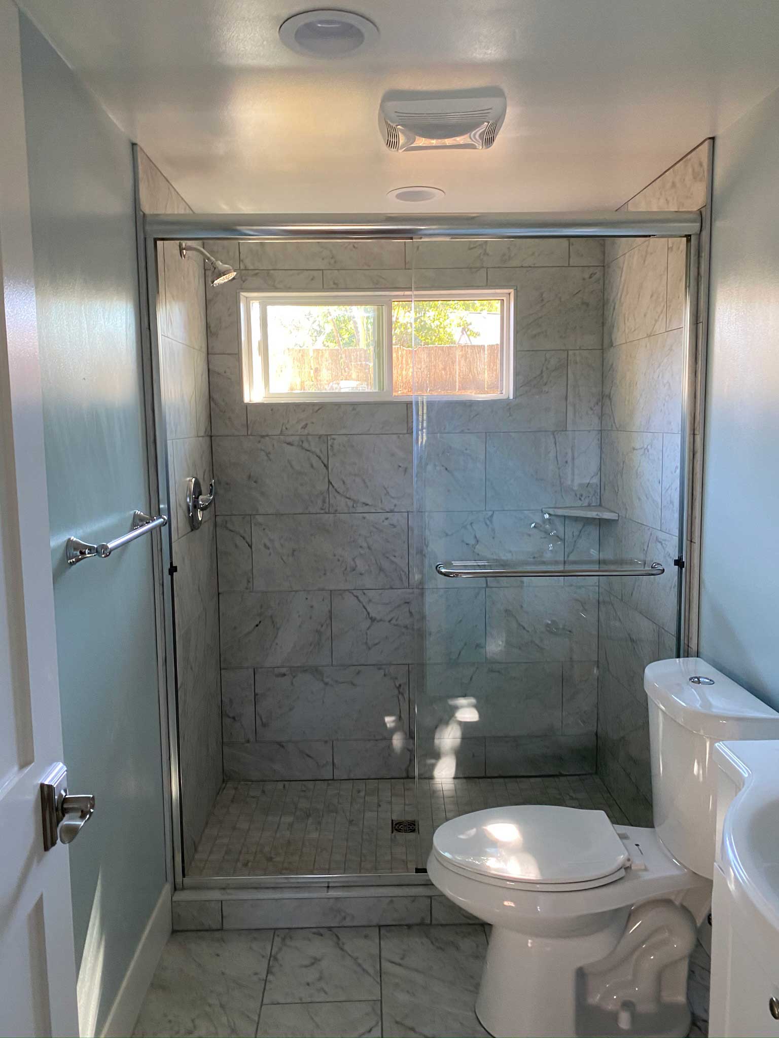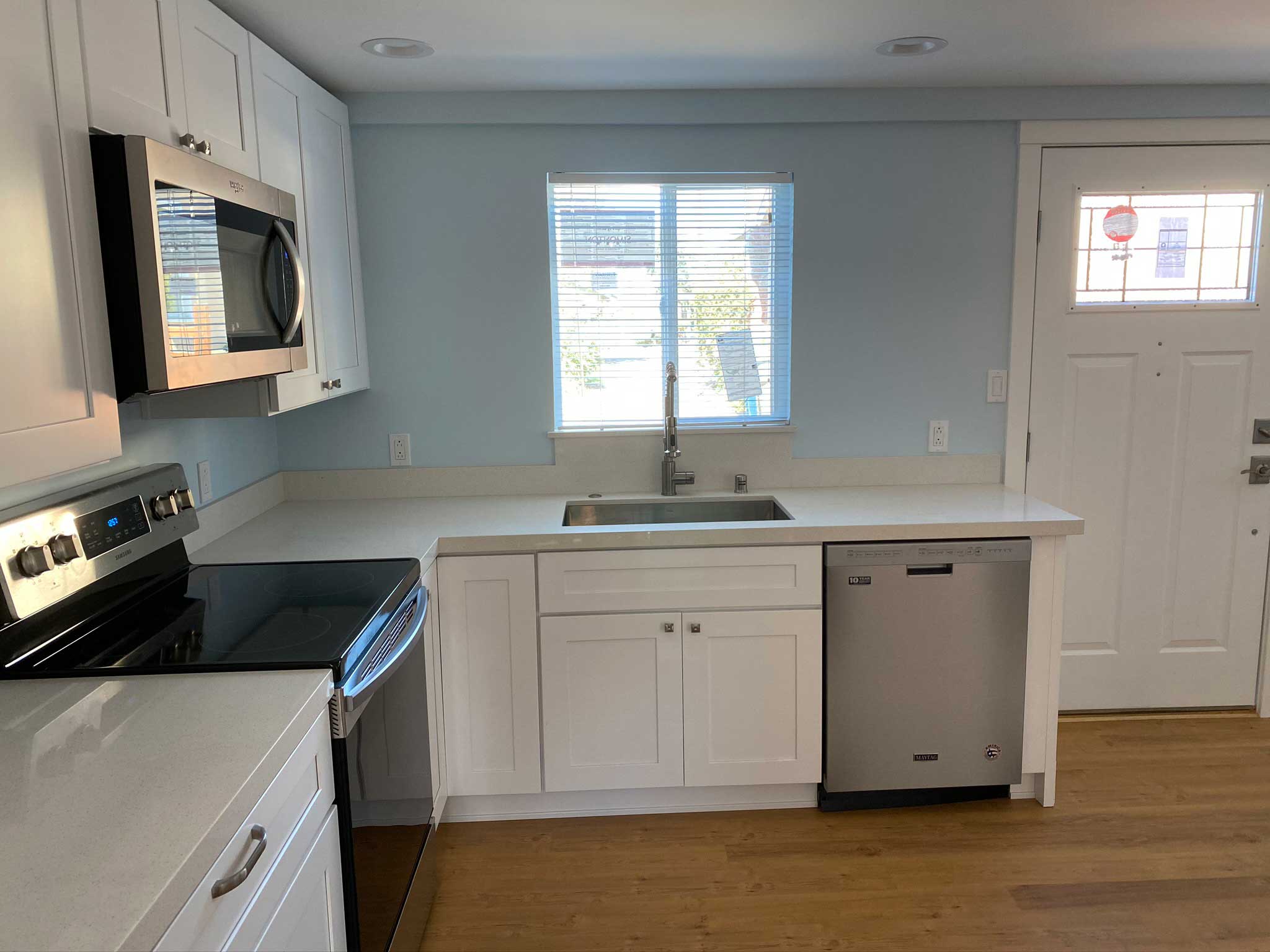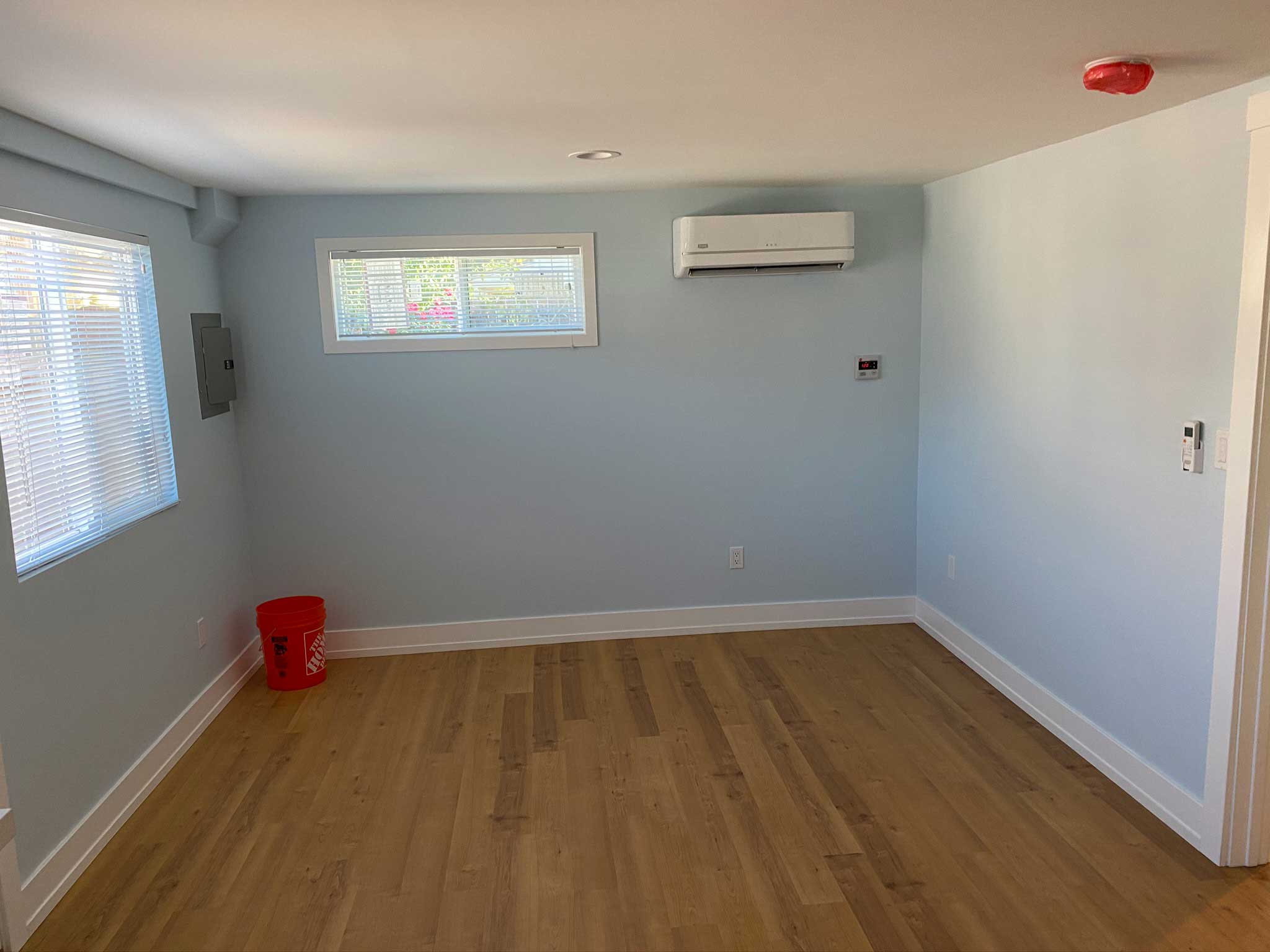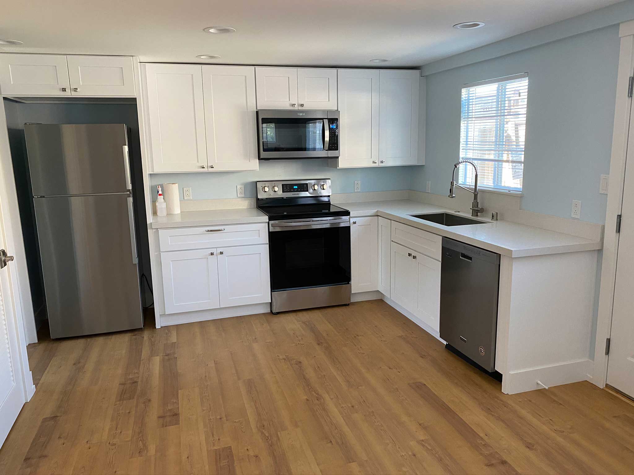 This charming garage conversion was transformed into a fully functional Accessory Dwelling Unit (ADU). Our team connected the new unit to the main sewer line to accommodate a complete kitchen and bathroom, ensuring full residential functionality and compliance with ADU building codes.